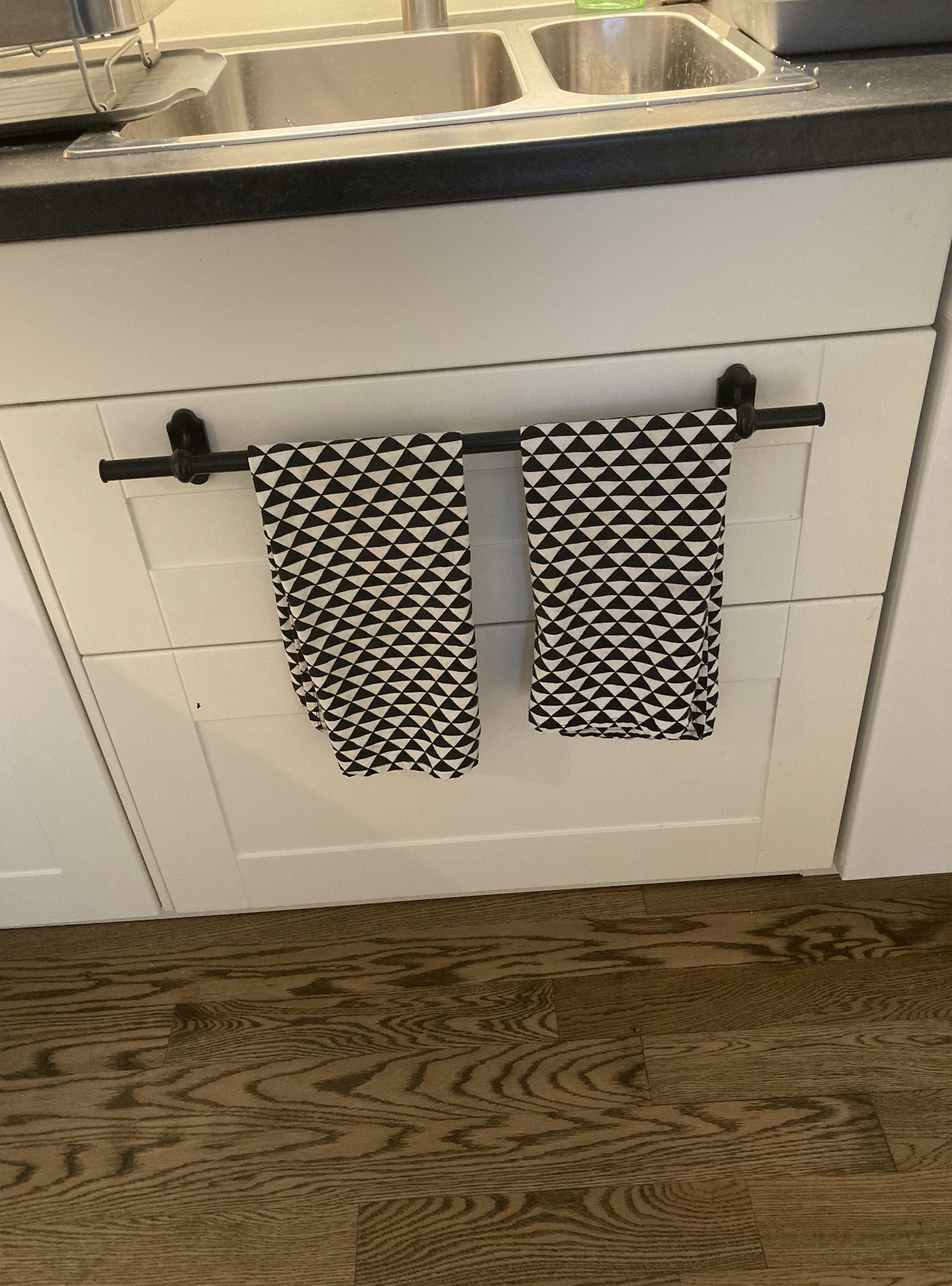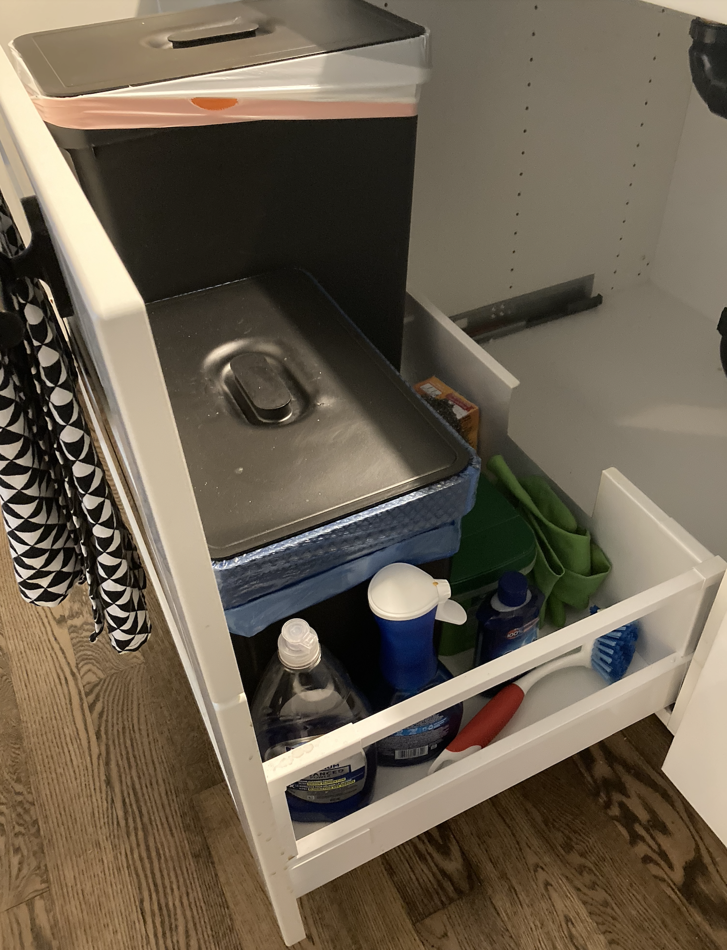 The kitchen is set up in an efficient L layout with island, presaging our new kitchen, and I love its solution for under-sink storage: an IKEA piece of cleverness where the whole thing pulls out like a huge drawer, using a towel rack handle, with lidded containers inside for garbage, recycling and sink bits. Want!, as the kids would say. My cabinet makers were less enthusiastic: apparently the design is rickety and won’t stand up well over time but, bless them, they are adapting the design to something that will function the same way and not compromise their commitment to long-lasting craftsmanship. (Use the arrow to move back-and-forth to see the outside and inside the IKEA piece of cleverness).