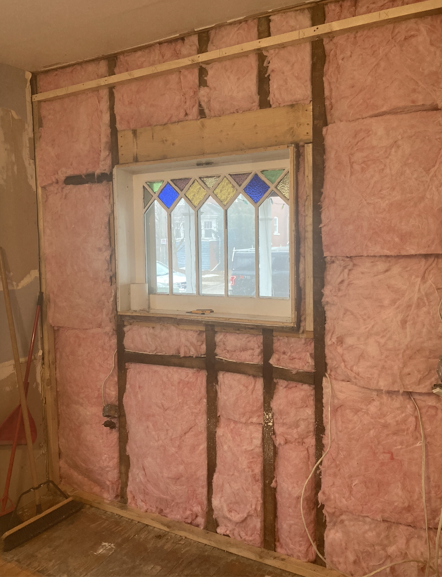 In the old kitchen room, we suspected there was poor insulation as, in the winter, dishes stored in the cupboards along an outside wall felt like they came out of the fridge. I had to remember during the day to take out dishes we intended to use that night when we stayed at our Stratford house. Once the crew ripped out those cupboards, they discovered bare walls with only small drifts of grey insulation. Yes, please, go ahead and order bales of that pink baton-y stuff.