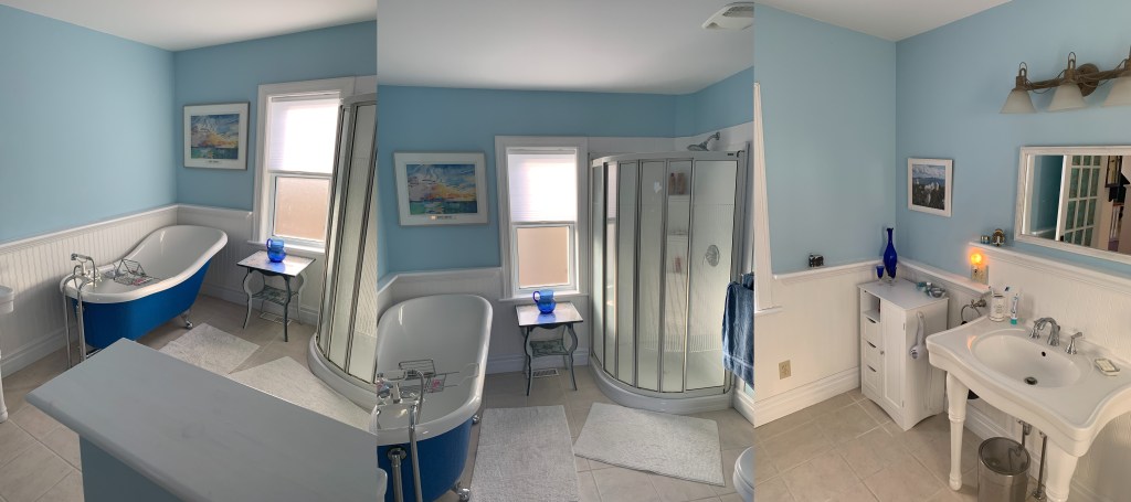 The bathroom in this old house is part of the latest addition and it is airy and spacious: Friends came to have a porch visit in fall of 2020 when we were following COVID-avoidance practices and we did a quick house tour, masked. “You can do social distancing in your bathroom!” Jeff remarked.