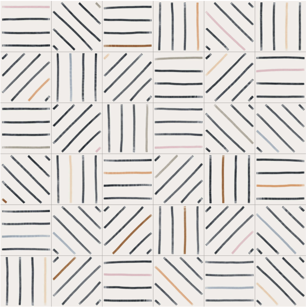 These 8″x8″ tiles come in several variations, but all feature what look like hand-drawn shapes or lines, as if done with a chisel-tip magic marker. At first I was enamoured of the tile that had four leaf-like ovals on each, but thought it might get too busy. We chose to order the version pictured above, which has a wide variety of different tiles, some with diagonal lines and some with lines up-and-down (or side to side, depending on how you turn the tile).