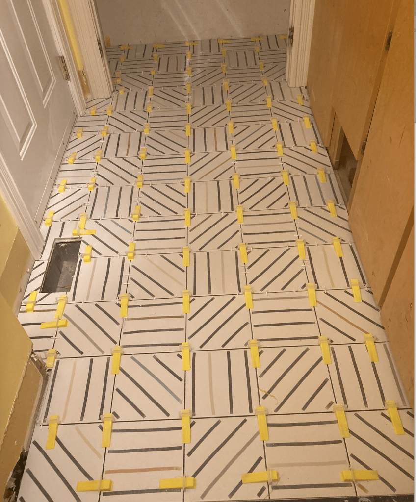 The tiles fit in the front hall perfectly, without cutting, six abreast, with one small height trim to the final tile row by the front door. Every tile was exactly 8″ x 8″. That exactitude saved the day.
