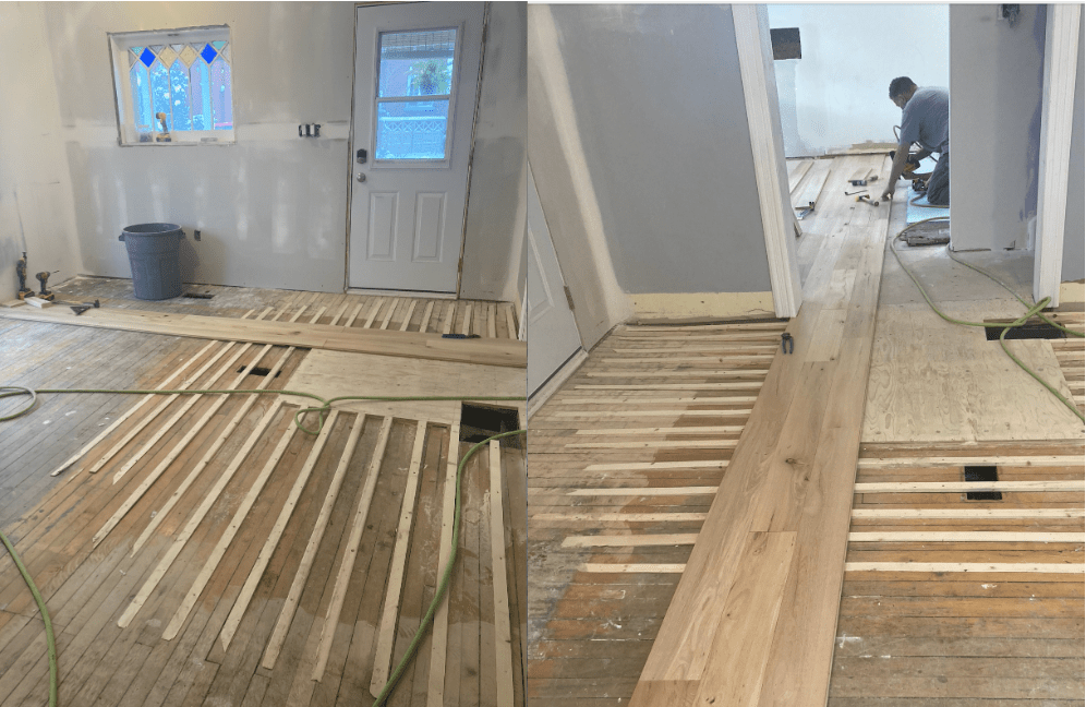 Our contractor, Jerry Walsh, and his team pulled a levelling miracle, using the green-laser guides and years of experience to shim and shuffle so that the entire main floor could flow as one even surface.