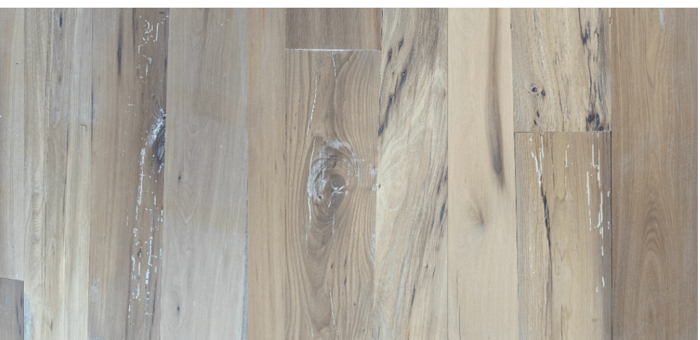 The finish got into every one of those character-filled nicks, knots, cracks and nail holes that are part of the charm of re-milled, reclaim old wood flooring. And it dried white — as if someone had spilled white paint on the raw wood and wiped it up, but couldn’t get the white out of any indentation.