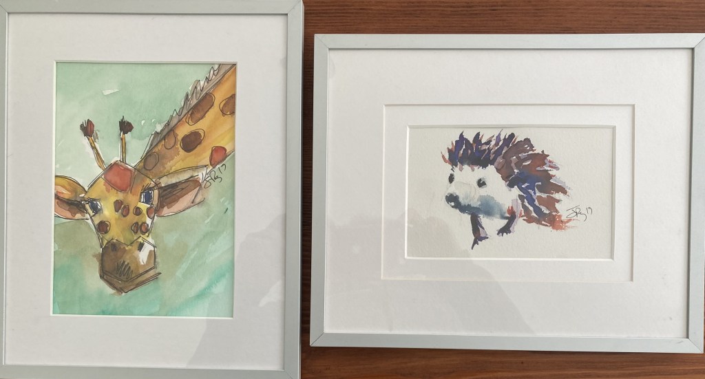 Many of the giraffe, hedgehog and rooster bits we have now are practical things we’ll continue to use as part of everyday life, from a hedgehog crumb brush to giraffe bookends. What creature art we have is small: a couple fun little rooster paintings (currently keeping each other company in our guest room) and these two small watercolours from a fundraiser run by artist Jane Roy.