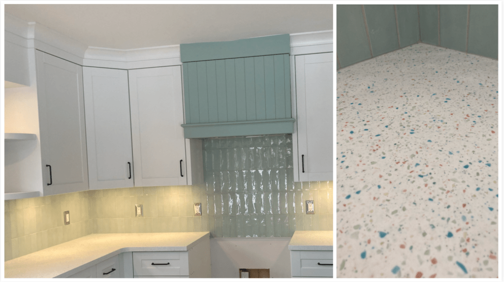 Everform is manufactured in thick sheets and, like regular Formica, can be molded. I don’t know how this happens but, when you join the sheets together to cover longer expanses, the seams completely disappear. (There is a 112-page fabrication guide you can download that likely provides a step-by-step on how this seamless seaming happens but, hey, at this stage I’m happy with “magic” as an answer.) I was so excited by this stuff that the first plan was to have it as both countertop and backsplash. However, this material is not heat-rated high enough to go behind a gas stove, so we decided to use tiling for backsplash and stick with the sea glass material on the horizontal surface.